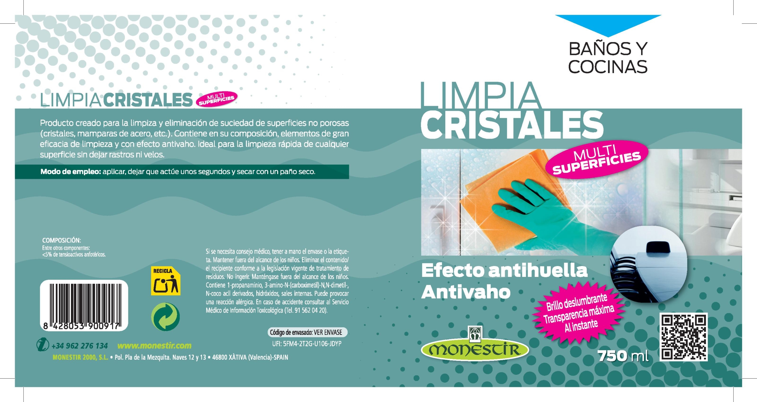 Producto creado para la limpiza y eliminación de suciedad de superficies no porosas (cristales, mamparas de acero, etc.). Contiene en su composición, elementos de gran eficacia de limpieza y con efecto antivaho. Ideal para la limpieza rápida de cualquier superficie sin dejar rastros ni velos.